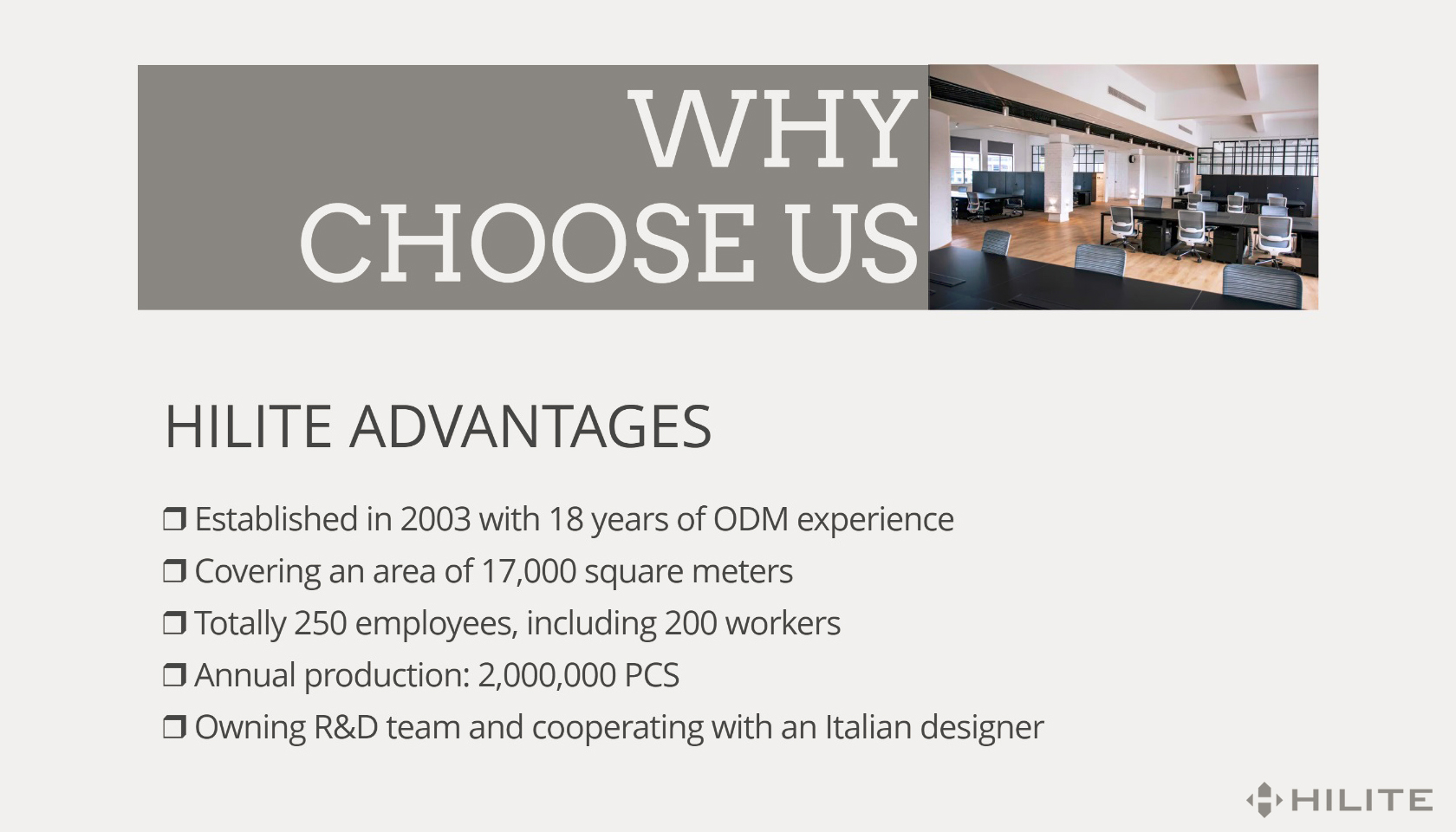 We have clean environment and comfortable atmosphere to improve the work efficiency